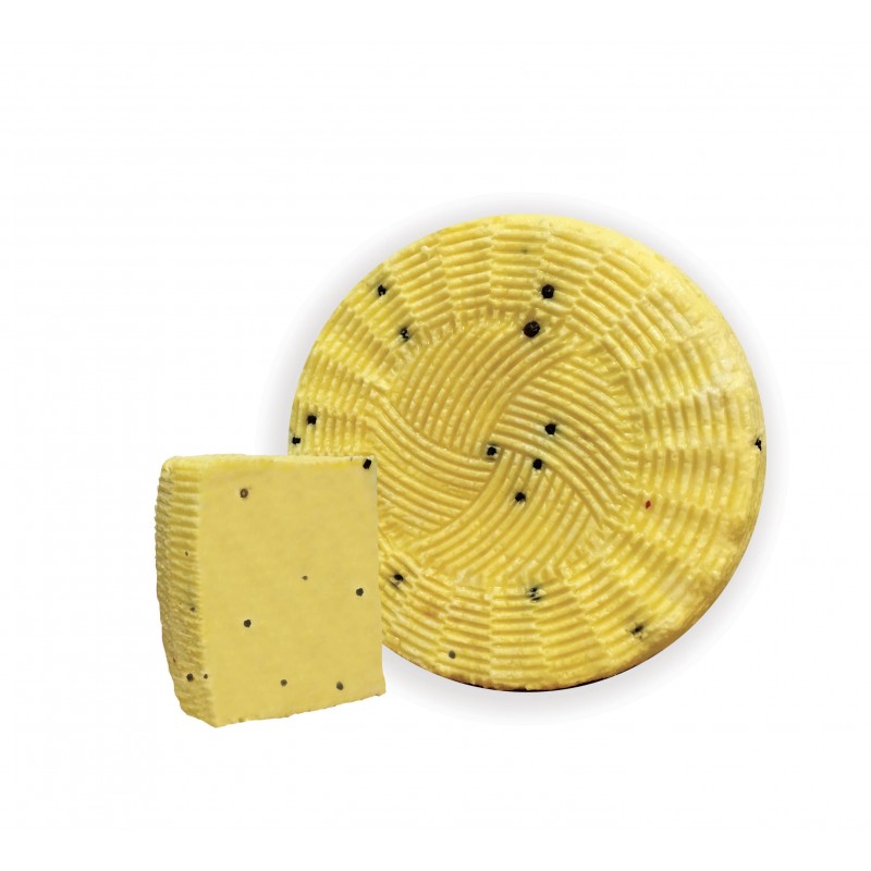 Un pecorino stagionato dalla struttura mediamente morbida e compatta. Prodotto con 100% di latte di pecora crudo, ha una stagionatura naturale di 4 mesi. Poco friabile, viene cosparso di pepe nero e zafferano in grani, durante la formatura nei canestri.